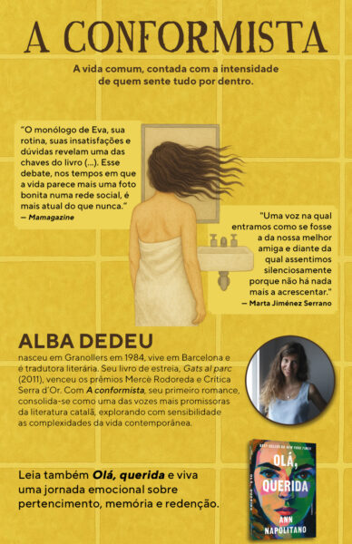 Em A conformista, seu primeiro romance, Alba Dedeu narra com notável sutileza e precisão os altos e baixos do cotidiano, as amarguras da convivência e essa angústia de baixa intensidade que envolve Eva, como a todos nós: a vertigem diante das possibilidades aparentemente infinitas que temos ao alcance e a constante incerteza de não saber se, entre todas elas, escolhemos a melhor.
