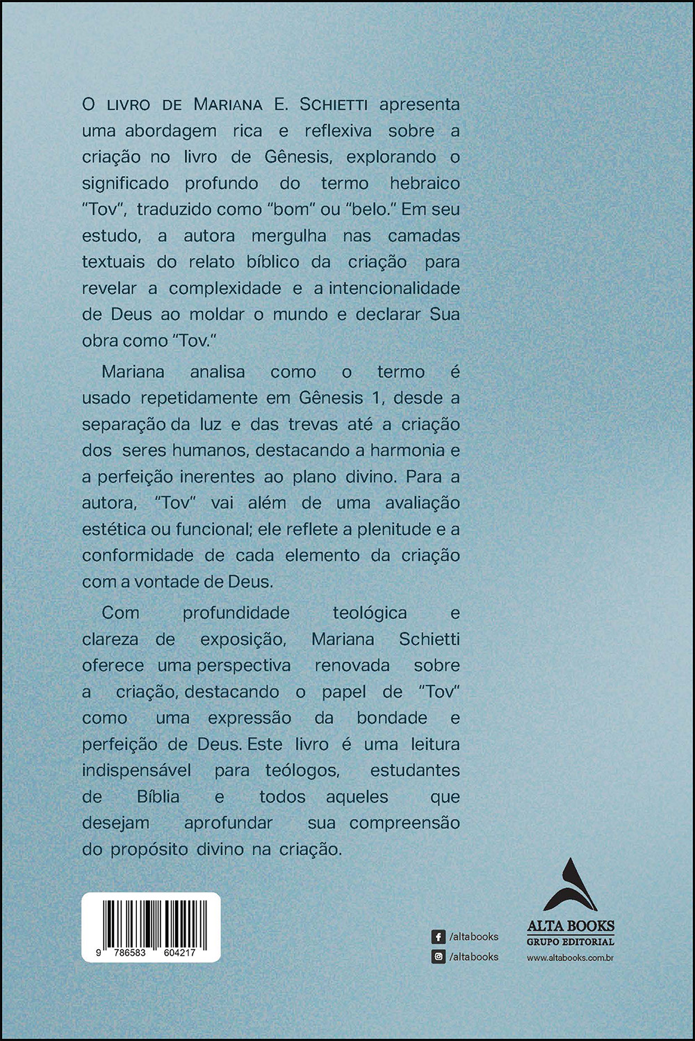 Com profundidade teológica e clareza de exposição, Mariana E. Schietti oferece uma perspectiva renovada sobre a criação, destacando o papel de “Tov” como uma expressão da bondade e perfeição de Deus. Este livro é uma leitura indispensável para teólogos, estudantes de Bíblia e todos aqueles que desejam aprofundar sua compreensão do propósito divino na criação.