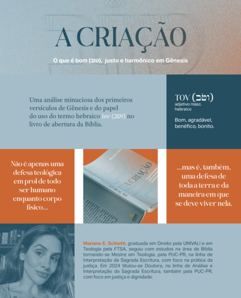 O livro de Mariana E. Schietti apresenta uma abordagem rica e reflexiva sobre a criação no livro de Gênesis, explorando o significado profundo do termo hebraico ”Tov”, traduzido como “bom” ou “belo.” Em seu estudo, a autora mergulha nas camadas textuais do relato bíblico da criação para revelar a complexidade e a intencionalidade de Deus ao moldar o mundo e declarar Sua obra como “Tov.”