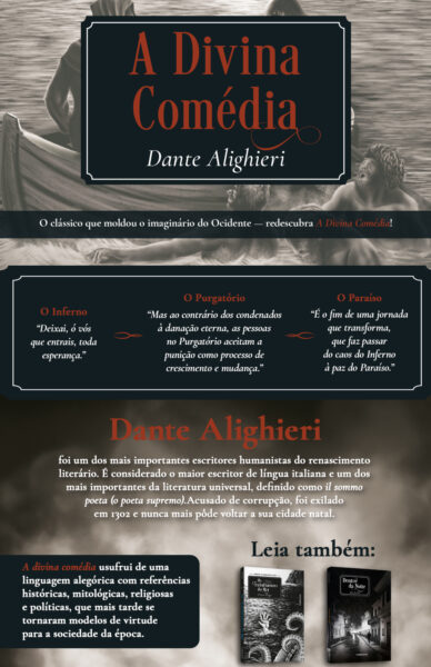 A divina comédia nos convida para uma peregrinação espiritual, atravessando os nove círculos do Inferno, os sete círculos do Purgatório e as nove esferas do Paraíso, na qual o leitor poderá buscar o perdão do divino através da edificação moral proposta.
