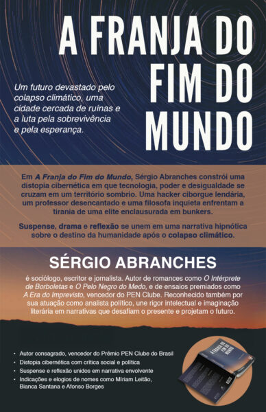 Gal já é uma das minhas personagens preferidas da literatura. Há semanas penso nela como uma amiga querida, à minha espera no futuro. Agradeço ao brilhantismo de Sérgio Abranches por nos presentear com essa aventura viciante, que projeta cenários distópicos ao retomar os caminhos cibernéticos que nos trouxeram até aqui. Bianca Santana Um romance que reúne informação consistente com suspense, drama, amor, sexo e esperança. Sérgio Abranches é um especialista em tecnologia e conseguiu levar para A Franja do Fim do Mundo uma ficção científica inventiva, culta e surpreendente. Você vai ficar hipnotizado. Leia. Afonso Borges Um livro inesperado, envolvente e sedutor. O mundo depois do fim, em que a distopia enfrenta a resistência. A leitora, o leitor se encantarão com personagens como Ricabê, Rãnagá, Gal. Ficarão inquietos com a descrição da vida nessa fronteira para a qual o mundo se move por desatino. A Franja do Fim do Mundo é um livro intenso e culto, do qual é difícil se separar antes do ponto final. Mas o ponto é mesmo final? Ou haverá um recomeço? Decidam. Míriam Leitão