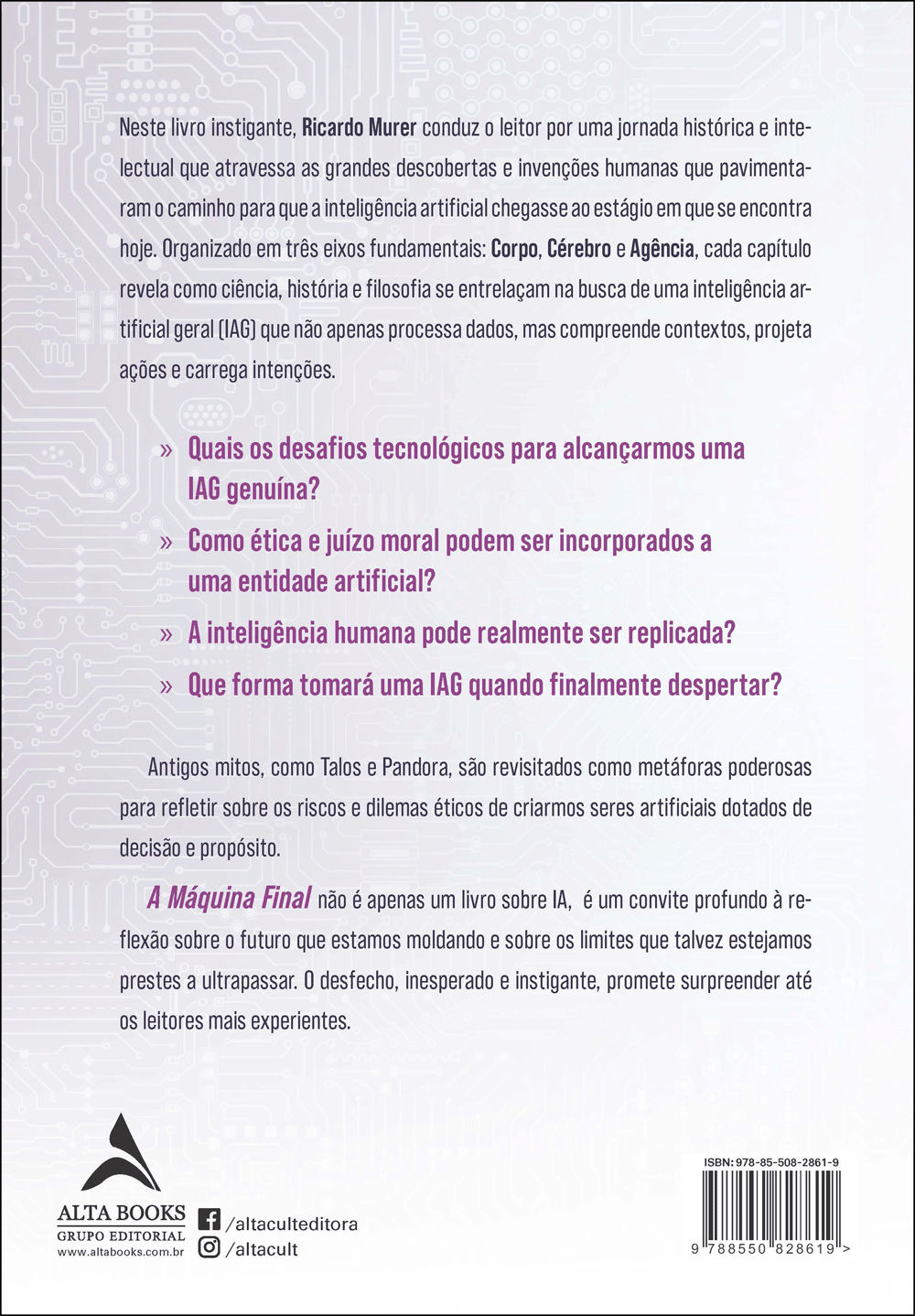 A Máquina Final conduz o leitor em uma jornada única sobre a origem, o desenvolvimento e o futuro da Inteligência Artificial Geral. Partindo de mitos antigos como Talos e Pandora, Ricardo Murer revela como ciência, filosofia e história moldaram nossa visão sobre máquinas inteligentes. Organizado em três pilares – Corpo, Cérebro e Agência – o livro discute os avanços tecnológicos e os dilemas éticos que acompanham a criação de entidades artificiais capazes de aprender, decidir e agir com autonomia. Mais do que um tratado técnico, é uma reflexão urgente sobre o impacto da IAG na sociedade e nos limites do que significa ser humano. Essencial para profissionais, estudantes e curiosos que desejam compreender os desafios e as possibilidades da era das máquinas pensantes.