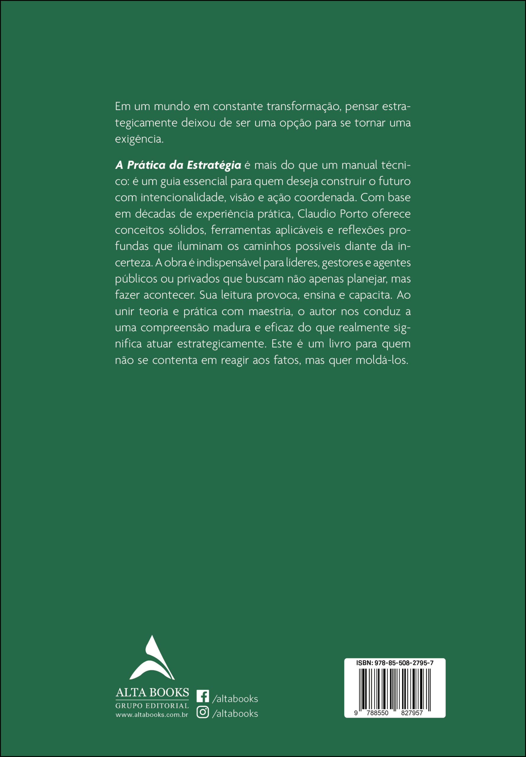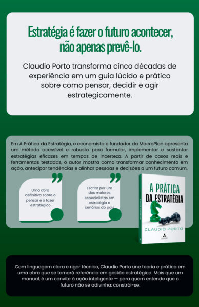 A Prática da Estratégia é mais do que um manual técnico: é um guia essencial para quem deseja construir o futuro com intencionalidade, visão e ação coordenada. Com base em décadas de experiência prática, Claudio Porto oferece conceitos sólidos, ferramentas aplicáveis e reflexões profundas que iluminam os caminhos possíveis diante da incerteza. A obra é indispensável para líderes, gestores e agentes públicos ou privados que buscam não apenas planejar, mas fazer acontecer. Sua leitura provoca, ensina e capacita. Ao unir teoria e prática com maestria, o autor nos conduz a uma compreensão madura e eficaz do que realmente significa atuar estrategicamente. Este é um livro para quem não se contenta em reagir aos fatos, mas quer moldá-los.