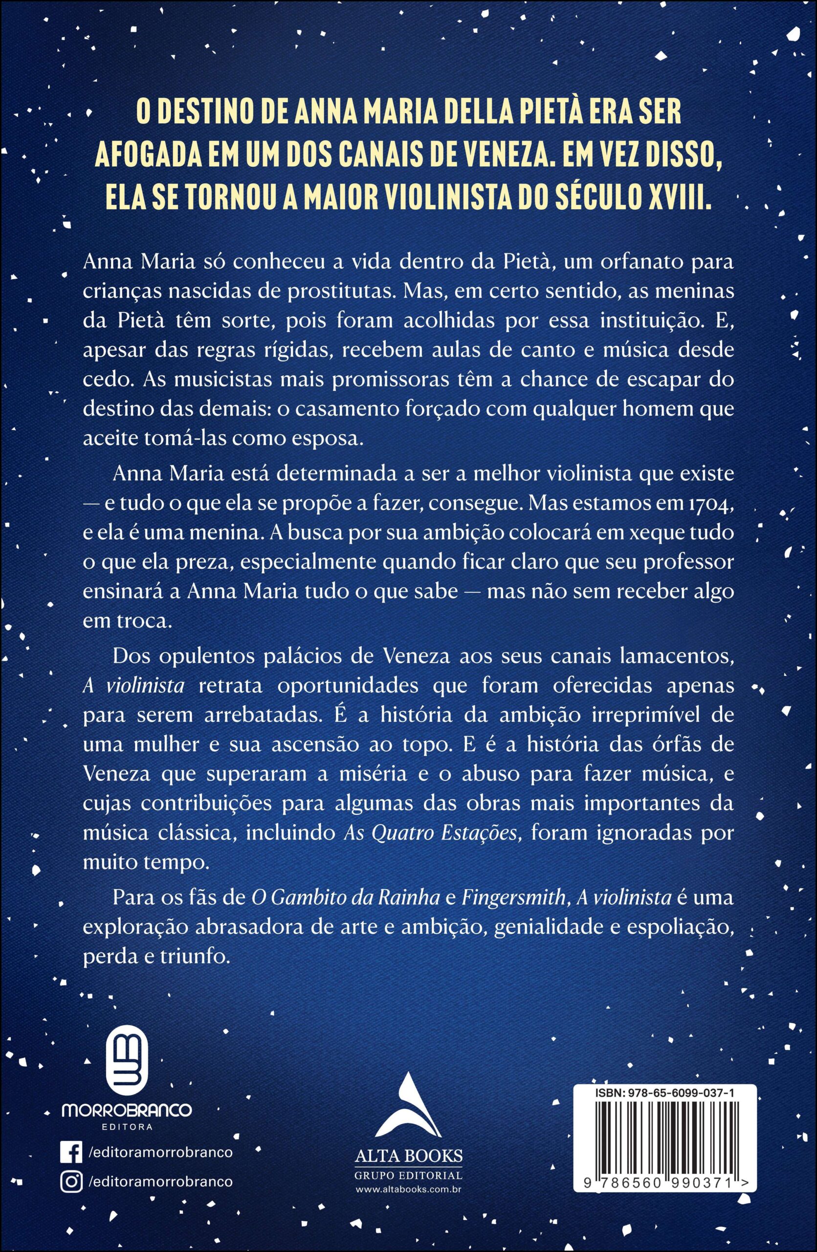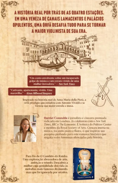 Dos opulentos palácios de Veneza aos seus canais lamacentos, A violinista retrata oportunidades que foram oferecidas apenas para serem arrebatadas. É a história da ambição irreprimível de uma mulher e sua ascensão ao topo. E é a história das órfãs de Veneza que superaram a miséria e o abuso para fazer música, e cujas contribuições para algumas das obras mais importantes da música clássica, incluindo As Quatro Estações, foram ignoradas por muito tempo.