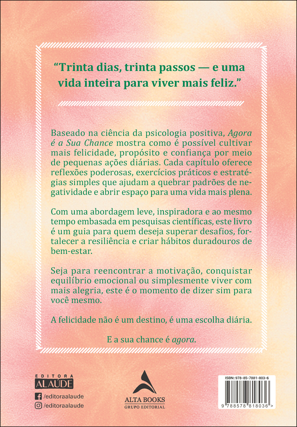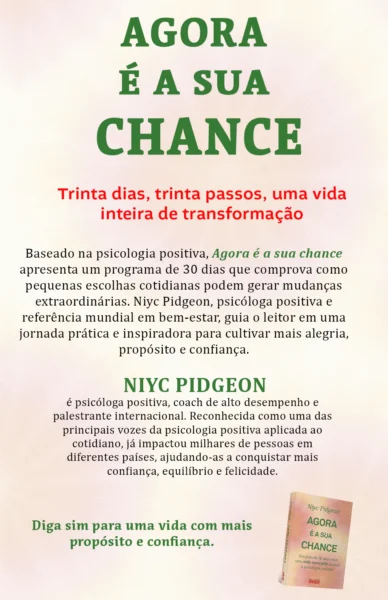 Agora é a Sua Chance é um guia prático e inspirador de 30 dias que utiliza os princípios da psicologia positiva para transformar a forma como você pensa, sente e vive. Escrito por Niyc Pidgeon, psicóloga reconhecida internacionalmente, o livro apresenta ferramentas simples e eficazes para cultivar gratidão, resiliência e otimismo. Cada capítulo traz reflexões, exercícios e estratégias que ajudam a substituir pensamentos negativos por atitudes de crescimento, além de desenvolver hábitos que promovem felicidade duradoura. Com linguagem envolvente e acessível, a autora mostra como pequenas mudanças diárias podem gerar grandes resultados em bem-estar, propósito e realização pessoal. Esta obra é ideal para quem busca mais energia, clareza e confiança para viver com plenitude.