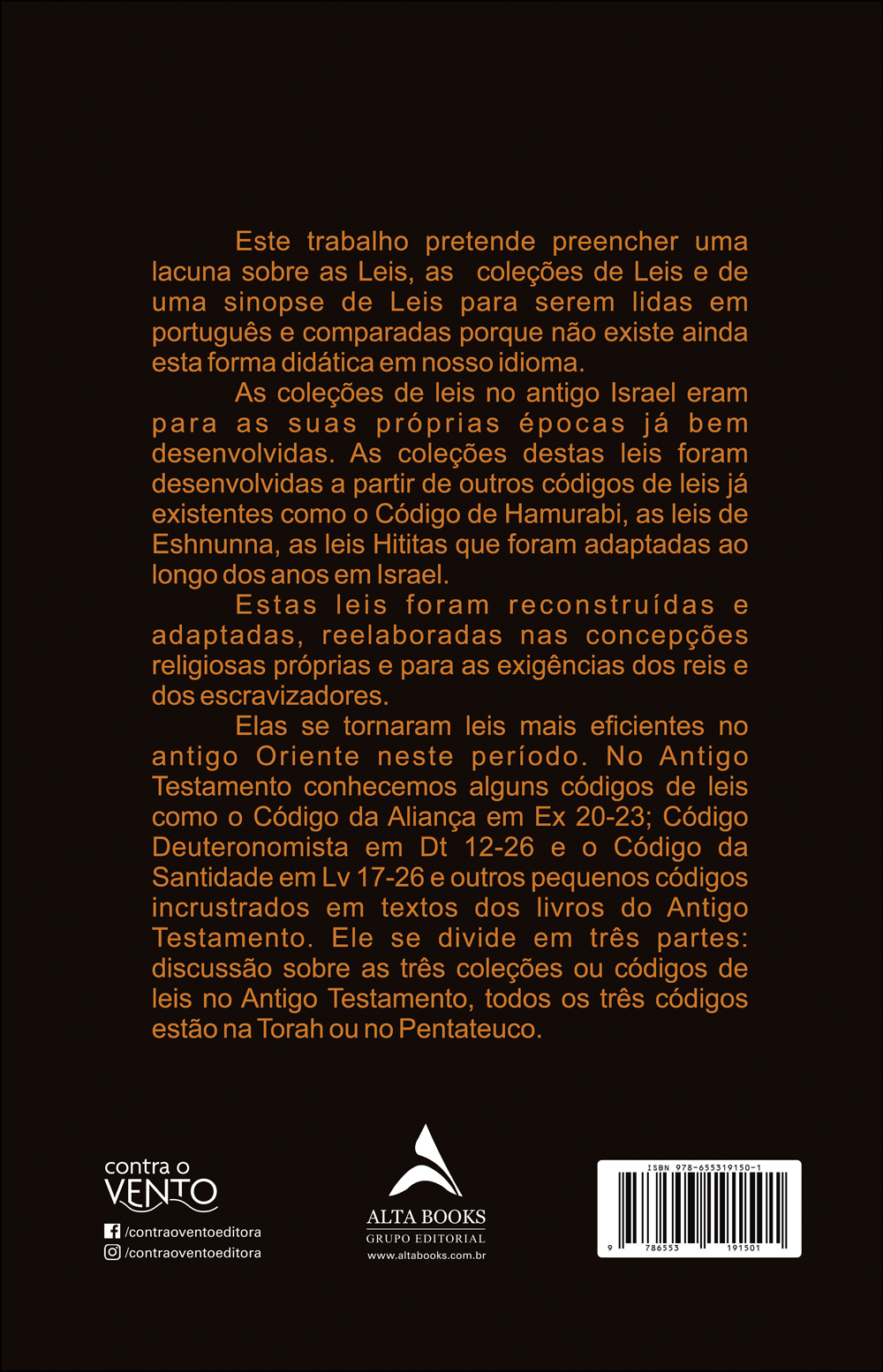 Este livro propõe-se a preencher uma lacuna nos estudos sobre as leis do Antigo Testamento, apresentando e analisando os principais códigos legais contidos na Torá, como o Código de Aliança (Ex 20–25), o Código Deuteronômico (Dt 17–28) e outros textos normativos. O autor explora como essas leis foram reconstruídas, adaptadas e relacionadas com as concepções religiosas e as exigências sociais e reais da época. A obra destaca a eficácia e a evolução dessas normas ao longo do tempo, oferecendo uma visão panorâmica e estruturada sobre o tema. Voltado para estudantes, pesquisadores e interessados em teologia e direito bíblico, o livro serve como um guia para compreender os fundamentos legais e éticos que orientam a busca por uma vida boa segundo a tradição judaico-cristã.