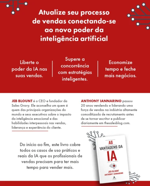 Navegar pelo novo mundo da IA pode parecer assustador, mas Blount e Iannarino no comando, As Vantagens da IA é uma jornada de empoderamento, inovação e profunda conexão humana — uma leitura essencial para todos os profissionais de vendas que buscam colher os benefícios de adotar uma abordagem proativa para esta nova tecnologia revolucionária.