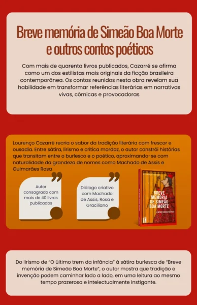 Entre nossos grandes estilistas, Machado de Assis e Guimarães Rosa são as maiores vítimas de emulação ou simples imitação. E quanta página morta em tais “homenagens”, em geral oriundas de candidatos a ficcionistas, alunos aplicados ou professores sisudos. Lourenço Cazarré, ao contrário de falsear estilos, com muito humor e sarcasmo prefere respirar, e tem fôlego de sobra para isso, ao lado de alguns desses monstros sagrados. O que é literatura? Cazarré responde. De início, com o conto “Um vate de incomensurável acuidade e furor”, e é a presença de Graciliano Ramos que dá o exato tempero a uma cômica e irônica resposta – de modo algum a única obra-prima deste livro. No segundo conto, “O último trem da infância”, é o poeta Joaquim Cardozo o motivo de outra resposta. Os três contos seguintes, embora entre si tão diferentes, respondem cada qual a seu modo à minha indagação inicial. Já o último, “Breve memória de Simeão Boa Morte”, outra impagável obra-prima, como novela burlesca atinge os cimos machadianos, uma imensa resposta, e à altura desses mesmos cimos. Ainda arrisco dizer que essa última história até o próprio Machado, gaiatamente, assinaria.