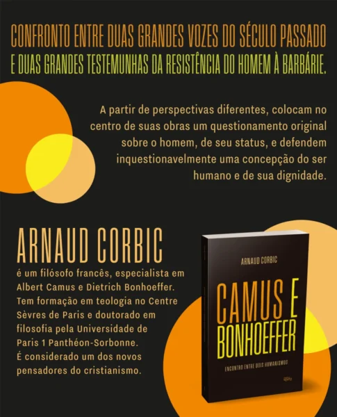 Este livro promove um encontro surpreendente entre Albert Camus, o pensador do absurdo e da dignidade humana, e Dietrich Bonhoeffer, teólogo da resistência ao nazismo e defensor de um cristianismo não religioso. Arnaud Corbic analisa como dois homens de mundos distintos – um filósofo ateu francês e um pastor luterano alemão – convergem em questões essenciais sobre ética, liberdade, sofrimento e a busca por sentido. Com uma abordagem crítica e profundamente humanista, a obra dialoga com temas atuais como espiritualidade, resistência moral e o papel da fé e da razão no mundo contemporâneo.