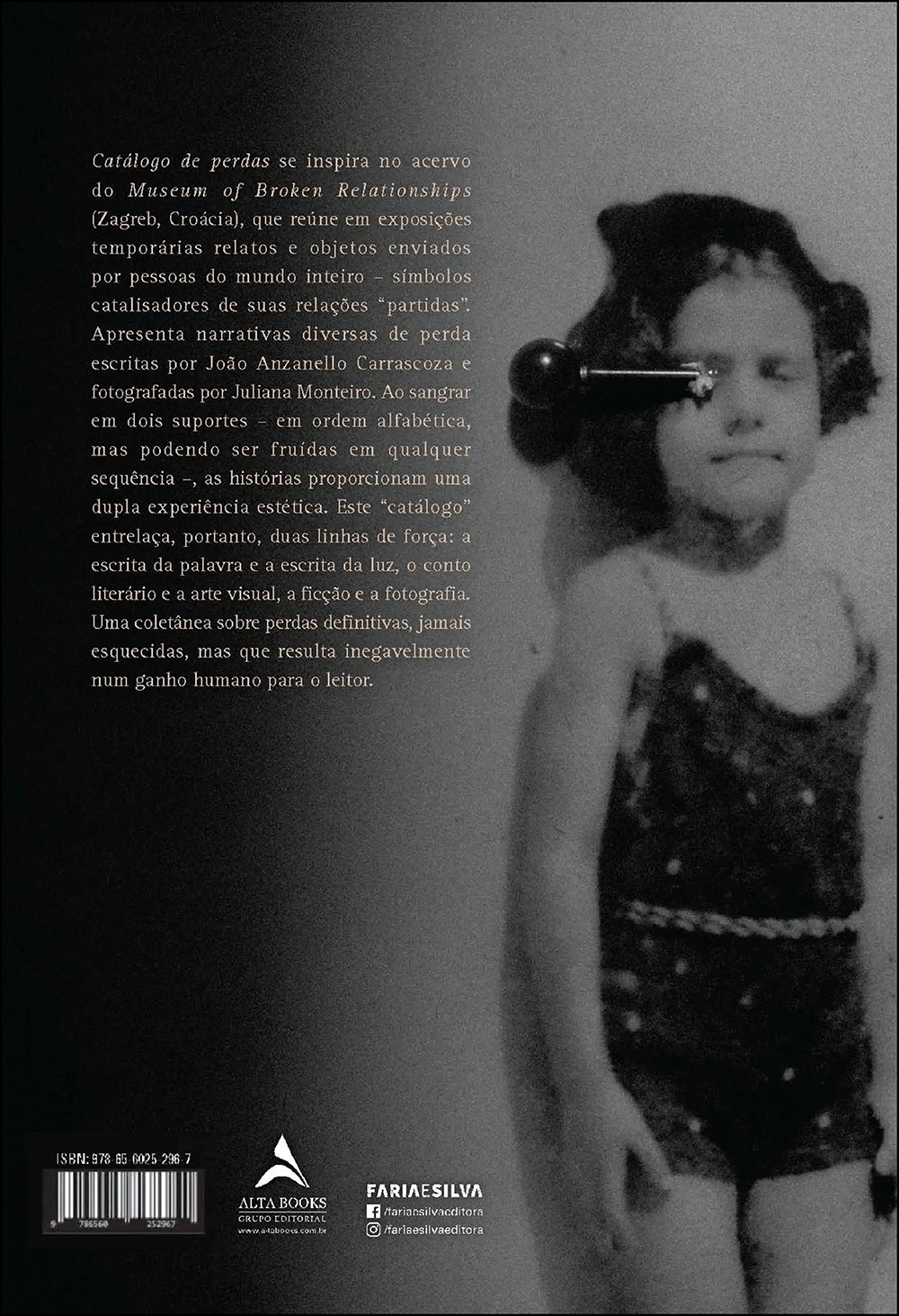 Catálogo de perdas se inspira no acervo do Museum of Broken Relationships (Zagreb, Croácia), que reúne em exposições temporárias relatos e objetos enviados por pessoas do mundo inteiro – símbolos catalisadores de suas relações “partidas”. Apresenta narrativas diversas de perda escritas por João Anzanello Carrascoza e fotografadas por Juliana Monteiro Carrascoza. Ao sangrar em dois suportes – em ordem alfabética, mas podendo ser fruídas em qualquer sequência –, as histórias proporcionam uma dupla experiência estética. Este “catálogo” entrelaça, portanto, duas linhas de força: a escrita da palavra e a escrita da luz, o conto literário e a arte visual, a ficção e a fotografia. Uma coletânea sobre perdas definitivas, jamais esquecidas, mas que resulta inegavelmente num ganho humano para o leitor.