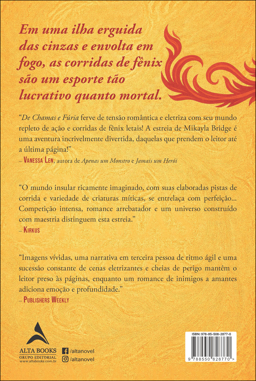 Em uma ilha erguida das cinzas, as corridas de fênix são o esporte mais mortal — e lucrativo — de Salta. Aos 17 anos, Kel Varra sonha em levar sua equipe, os Uivadores Escarlates, à vitória. Quando sua casa é incendiada e ela se vê obrigada a trabalhar para um magnata misterioso que deseja sua fênix, Savita, Kel descobre uma conspiração capaz de destruir tudo o que ama. Ao lado de Warren “Coup” Coupers, seu rival arrogante e irresistível, ela é arrastada para um jogo de poder, fogo e paixão. Entre apostas mortais, traições e a chama de um romance inesperado, Kel terá de escolher: vencer ou queimar.