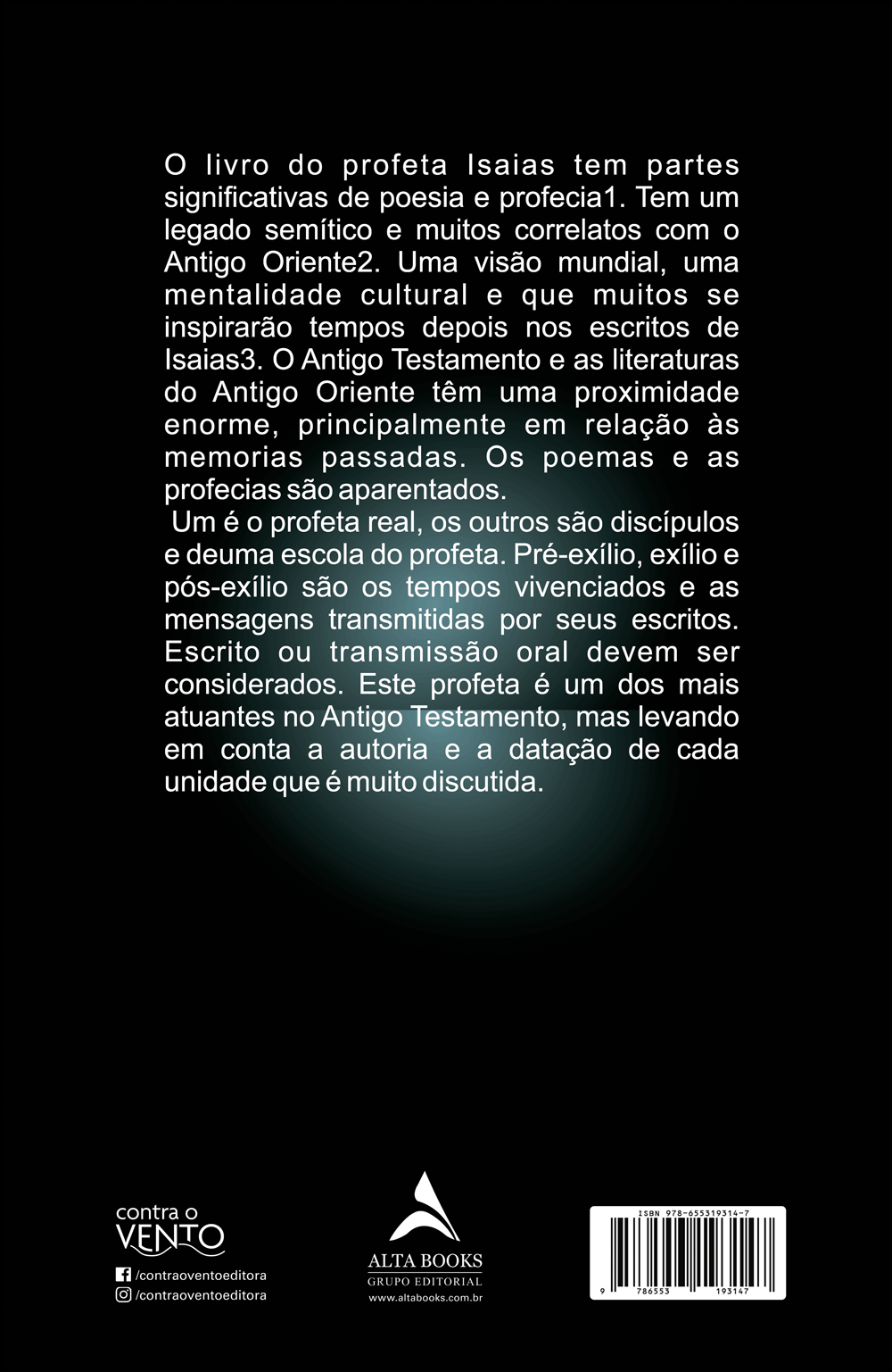 Este livro oferece um estudo profundo do livro do profeta Isaías, analisando-o através de três lentes interligadas: a História, a Literatura e a Teologia. Reconhecendo a natureza complexa e poética do texto, a obra explora seu legado semítico e seus diálogos com as literaturas do Antigo Oriente. Aborda os debates sobre autoria e formação do livro, apresentando a visão de uma escola profética que transmitiu e desenvolveu a mensagem de Isaías ao longo dos períodos do Pré-exílio, Exílio e Pós-exílio. “Contra o Vento” é uma obra erudita e acessível, que busca iluminar a poderosa mensagem teológica e a riqueza literária de um dos textos mais influentes do Antigo Testamento, destacando sua relevância e capacidade de inspirar em diferentes contextos históricos.