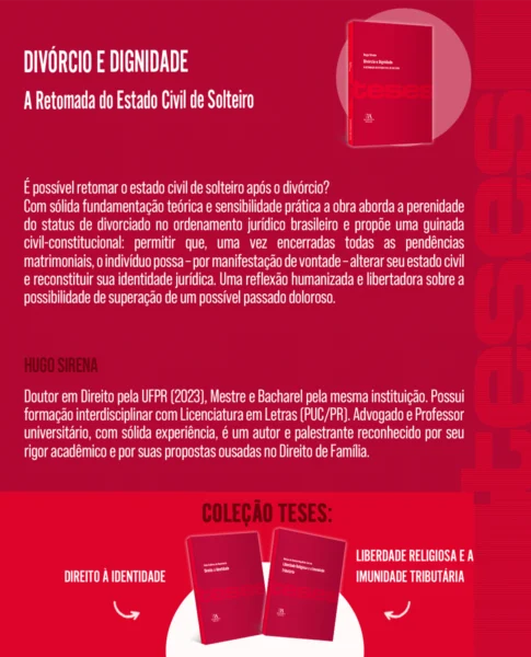 Com sólida fundamentação teórica e sensibilidade prática, Hugo Sirena – advogado, professor universitário e palestrante – questiona a perenidade do status de divorciado no ordenamento jurídico brasileiro e propõe uma guinada civil-constitucional: permitir que, uma vez encerradas todas as pendências matrimoniais, o indivíduo possa – por manifestação de vontade – alterar seu estado civil e reconstituir sua identidade jurídica.