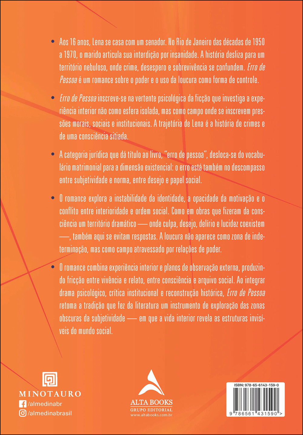 Aos 16 anos, Lena se casa com um senador. No Rio de Janeiro das décadas de 1950 a 1970, o marido articula sua interdição por insanidade. A história desliza para um território nebuloso, onde crime, desespero e sobrevivência se confundem. Erro de Pessoa é um romance sobre o poder e o uso da loucura como forma de controle.