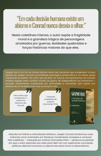 Nesta coletânea intensa e profundamente humana, Joseph Conrad revela sua maestria ao explorar as sombras da condição moral, os dilemas da lealdade e o peso das escolhas individuais diante de mundos em convulsão. “Gaspar Ruiz”, narrativa que abre o volume, acompanha a trajetória trágica de um homem simples arrastado pelas forças brutais da guerra de independência sul-americana. Entre acusações injustas, manipulações políticas e promessas de redenção, Ruiz se torna vítima e símbolo de um conflito maior que ele próprio.