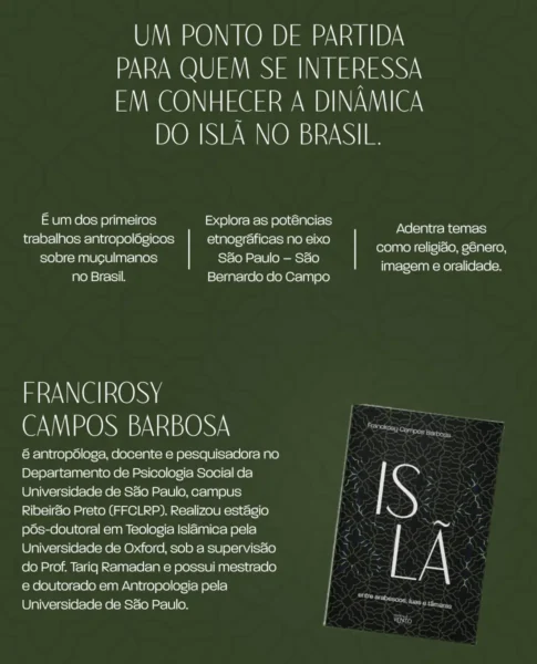Islã: Entre arabescos, luas e tâmaras apresenta uma etnografia inédita sobre a vivência muçulmana no Brasil, especialmente em São Paulo e São Bernardo do Campo. A antropóloga Francirosy Campos Barbosa combina observação de rituais, entrevistas e etnografia visual para investigar o cotidiano das comunidades islâmicas, suas práticas religiosas e seus sentidos de pertencimento. Inspirada na teoria da performance, a autora descreve como corpo, gestualidade, oralidade e temporalidade estruturam a experiência do sagrado no Islã. A obra revela a diversidade interna da comunidade muçulmana brasileira e contribui para desfazer estereótipos, mostrando a riqueza cultural e espiritual presente em seus ritos, festas, jejuns e peregrinações. Um livro essencial para estudiosos da religião, ciências sociais e para leitores interessados em compreender a presença do Islã no Brasil contemporâneo.