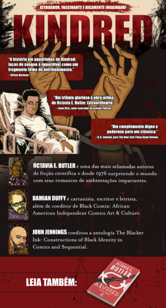 Esta arrebatadora adaptação em quadrinhos do clássico da ficção científica escrito por Octavia E. Butler traz um olhar tocante, poderoso e resoluto sobre a violência e os perturbadores efeitos da escravidão sobre as pessoas unidas por suas correntes, tanto pretas quanto brancas — entre as quais se forjam laços de sangue, no mais profundo dos sentidos.