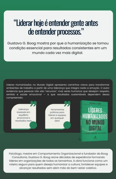 Líderes Humanizados no Mundo Digital indica caminhos e nos lembra que pessoas não são meros “recursos humanos”, mas sim seres humanos e querem ser tratadas como tal. Os líderes e os liderados são fundamentais para atingir resultados com pessoas e inovação. Líderes humanizados equilibram razão e emoção e precisam de apoio quando esse equilíbrio é insuficiente. Dentro de cada líder existe um ser humano que precisa ser mobilizado para que a humanização aconteça.