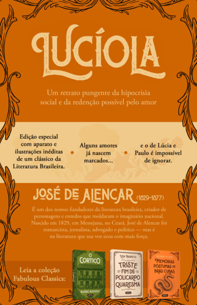 Em Lucíola, José de Alencar expõe com elegância e contundência as contradições da sociedade carioca do século XIX, ao narrar a paixão entre um jovem idealista e uma cortesã marcada por um passado que insiste em silenciá-la. Longe de estereótipos fáceis, Lúcia é uma figura trágica e fascinante, cuja dor íntima revela as violências invisíveis impostas às mulheres. Com lirismo e crítica social sutil, Alencar constrói um romance que desafia aparências e questiona a moralidade de um tempo — e talvez, de todos os tempos.