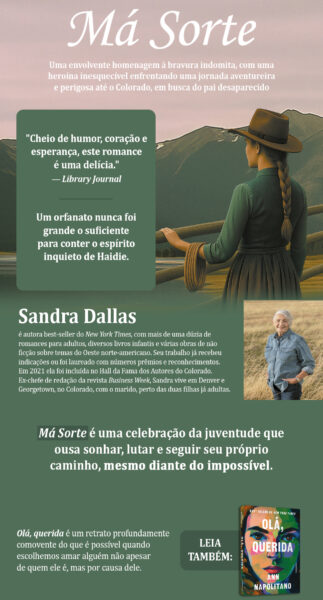 Má Sorte é um retrato vibrante da determinação juvenil e da astúcia feminina em tempos de adversidade. Com humor, ternura e uma prosa fluida que cavalga em ritmo certeiro, Sandra Dallas entrega uma história com personagens inesquecíveis — e uma heroína que nos ganha desde a primeira mentira.