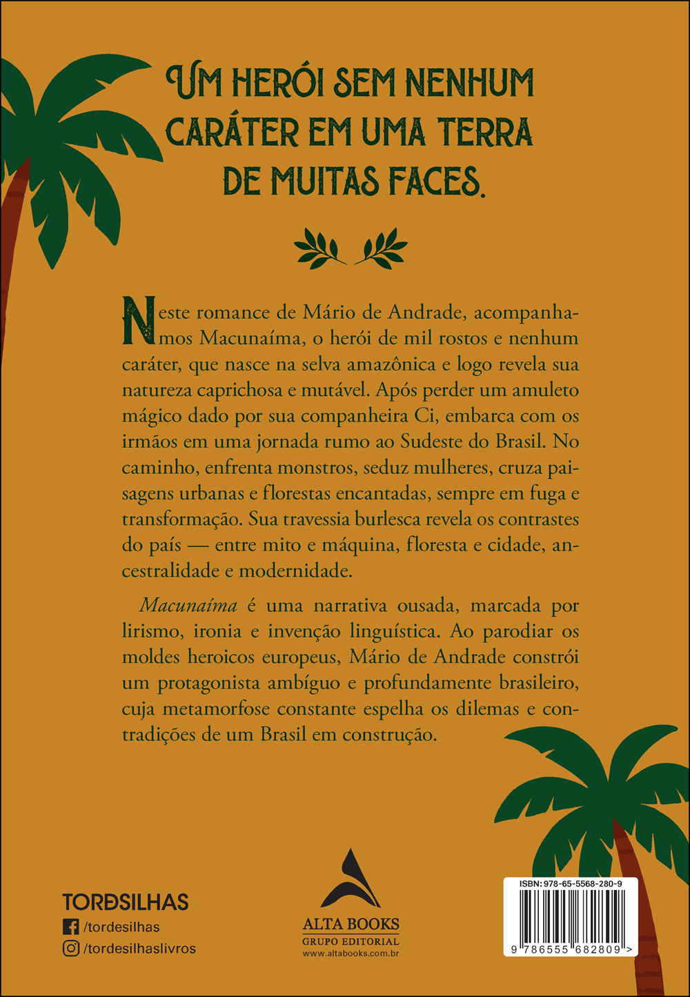Neste romance de Mário de Andrade, acompanhamos Macunaíma, o herói de mil rostos e nenhum caráter, que nasce na selva amazônica e logo revela sua natureza caprichosa e mutável. Após perder um amuleto mágico dado por sua companheira Ci, embarca com os irmãos em uma jornada rumo ao Sudeste do Brasil. No caminho, enfrenta monstros, seduz mulheres, cruza paisagens urbanas e florestas encantadas, sempre em fuga e transformação. Sua travessia burlesca revela os contrastes do país — entre mito e máquina, floresta e cidade, ancestralidade e modernidade.