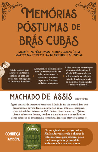 Machado de Assis convida o leitor a mergulhar nas memórias fragmentadas de um morto que, livre das convenções sociais, revela com sarcasmo e melancolia os caprichos, as vaidades e os fracassos de sua existência. Com uma narração em primeira pessoa que desafia o tempo, a obra oferece uma sutil e implacável sondagem psicológica da sociedade brasileira, conduzida por uma voz que, mesmo do além, permanece desconcertante e atual.