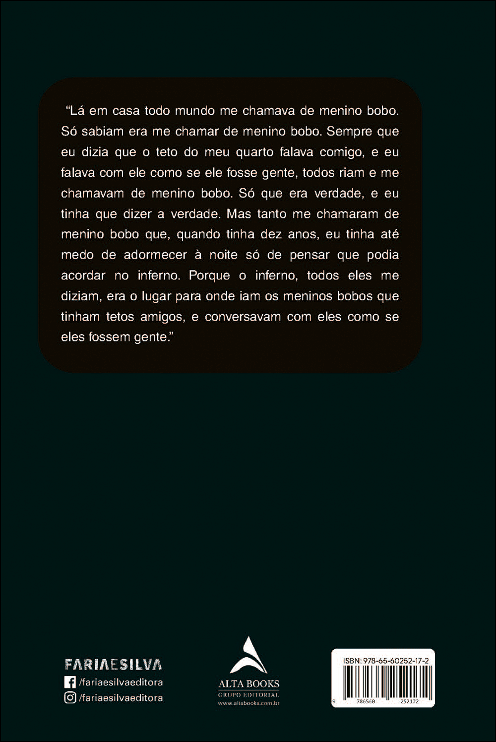 “Lá em casa todo mundo me chamava de menino bobo. Só sabiam era me chamar de menino bobo. Sempre que eu dizia que o teto do meu quarto falava comigo, e eu falava com ele como se ele fosse gente, todos riam e me chamavam de menino bobo. Só que era verdade, e eu tinha que dizer a verdade. Mas tanto me chamaram de menino bobo que, quando tinha dez anos, eu tinha até medo de adormecer à noite só de pensar que podia acordar no inferno. Porque o inferno, todos eles me diziam, era o lugar para onde iam os meninos bobos que tinham tetos amigos, e conversavam com eles como se eles fossem gente.”