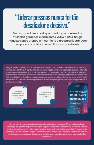 Neste livro, Sergio Augusto Lopes apresenta os 5 Protocolos da Liderança Humanizada: Consideração, Empatia, Esperança, Coragem e Gentileza.