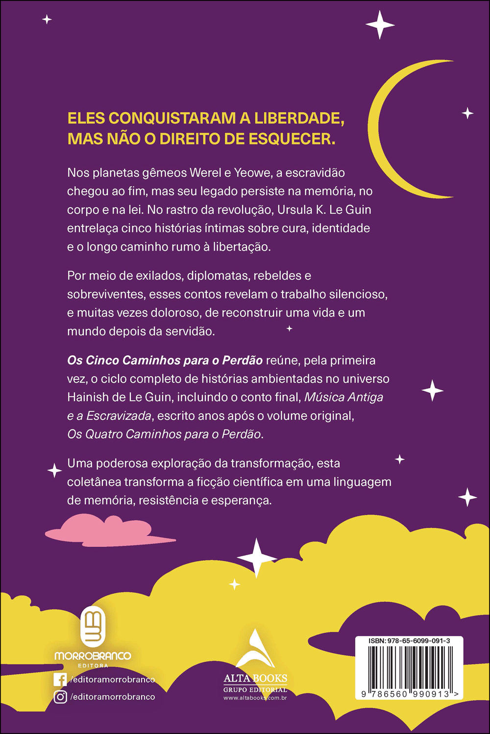 Os Cinco Caminhos para o Perdão reúne, pela primeira vez, o ciclo completo de histórias ambientadas no universo Hainish de Le Guin, incluindo o conto final, Música Antiga e a Escravizada, escrito anos após o volume original, Os Quatro Caminhos para o Perdão.