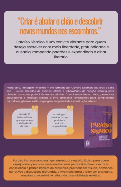 PARAÍSO SÍSMICO: AS SUBVERSÕES CRIATIVAS DA ESCRITA LITERÁRIA é um convite a todos que desejam assimilar os mecanismos da expressão literária e do pensamento crítico. É um provocativo tremor de terra capaz de bagunçar até as nuvens e as estrelas mais resistentes a novas ideias.