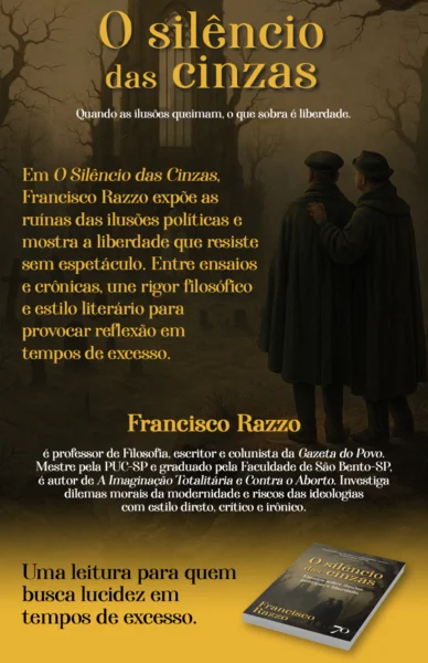 O silêncio das cinzas é um ensaio filosófico de Francisco Razzo que reflete sobre a liberdade em tempos de desencanto político e cultural. Em linguagem direta, ora irônica, ora confessional, o autor percorre os escombros das ideologias modernas, denunciando promessas de salvação histórica, moralismos de ocasião e a lógica do espetáculo. Entre a crônica e o ensaio, Razzo analisa os limites da política, os riscos do secularismo e a fragilidade das utopias, aproximando-se de pensadores como Simone Weil e Albert Camus. O livro rejeita a ilusão de respostas fáceis: não há consolo, apenas perguntas. A liberdade que resta, após a queima dos ídolos, é silenciosa, interior, resistente — uma forma de vida que recusa a histeria e preserva o pensamento. É uma obra para quem desconfia das grandes causas e busca cultivar, ainda, a coragem da reflexão sem espetáculo.
