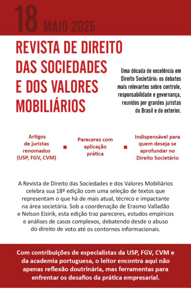 A 18ª edição da Revista de Direito das Sociedades e dos Valores Mobiliários marca os 10 anos do Instituto IDSVM com reflexões de grandes nomes do Direito Societário. Com artigos e pareceres assinados por autores como Erasmo Valladão e Marcelo von Adamek, a edição traz temas centrais como o abuso de voto da minoria, a responsabilização de administradores, o regime de informações em alienações de controle, e a aplicação do juízo de entire fairness. A publicação oferece uma abordagem interdisciplinar, que alia rigor técnico e relevância prática, com contribuições da doutrina estrangeira e análises empíricas sobre o mercado brasileiro. Ideal para quem atua no contencioso societário, consultoria empresarial ou pesquisa acadêmica.