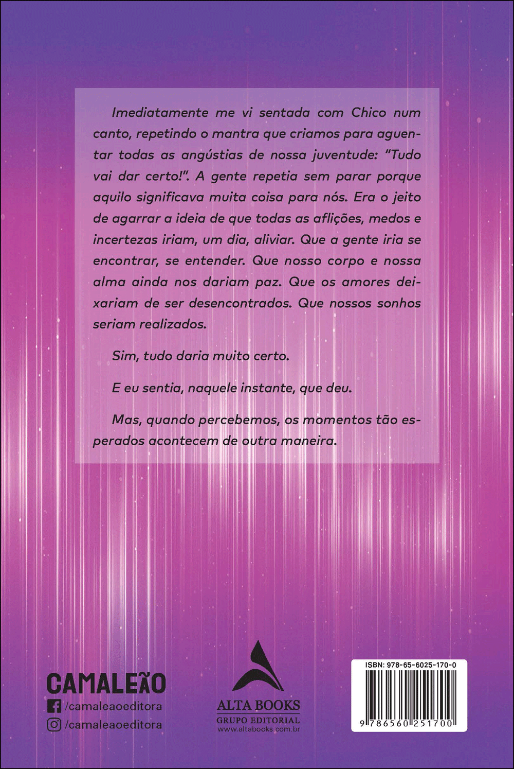 Imediatamente me vi sentada com Chico num canto, repetindo o mantra que criamos para aguentar todas as angústias de nossa juventude: “Tudo vai dar certo!”. A gente repetia sem parar porque aquilo significava muita coisa para nós. Era o jeito de agarrar a ideia de que todas as aflições, medos e incertezas iriam, um dia, aliviar. Que a gente iria se encontrar, se entender. Que nosso corpo e nossa alma ainda nos dariam paz. Que os amores deixariam de ser desencontrados. Que nossos sonhos seriam realizados. Sim, tudo daria muito certo. E eu sentia, naquele instante, que deu. Mas, quando percebemos, os momentos tão esperados acontecem de outra maneira.